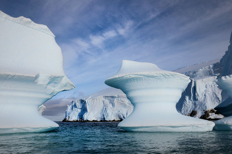 Solen står op og oplyser den hvide verden, der breder sig ud foran os. En gletsjer strækker sine arme ud mod horisonten. Bjergene rejser sig og bryder den bløde himmel. Vores position er 64º41’S, 62º38’V, når vi ser kontinentet for første gang. Mens vi sejler væk fra vores ekspeditionsfartøj, skærer vores gummibåd sig dybere ind mellem et virvar af isbjerge. Pludselig, med gletsjeren som baggrund, løfter en hale sig ud af vandet. Det er en pukkelhval. De er kendte for deres optræden i overfladen, hvor de breach’er (springer) og klasker med halerne og får skyer af vanddråber til at rejse sig. De er lette at kende på deres lange brystfinner og knubbede hoveder.