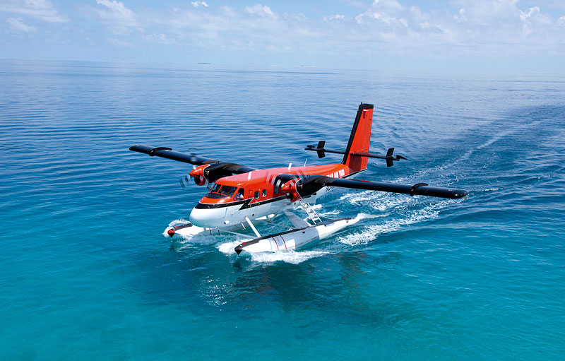 Al transport til og fra Maldiverne foregår via lufthaven ved hovedstaden Male. Derfra sejler mange liveaboards mod syd eller nord, men der afgår også en sværm af små taxifly til de mange resorts, som udgør rygraden i landets turistindustri. Maldivian Air Taxi har verdens største flåde af De Haviland Twin Otters udstyret med pontoner, så de kan lande og lette overalt, hvor der er vand. Og vand er der meget af i Maldiverne. Piloterne er klædt i ulastelige hvide, nystrøgne skjorter, shorts med pressefolder – og bare tæer.