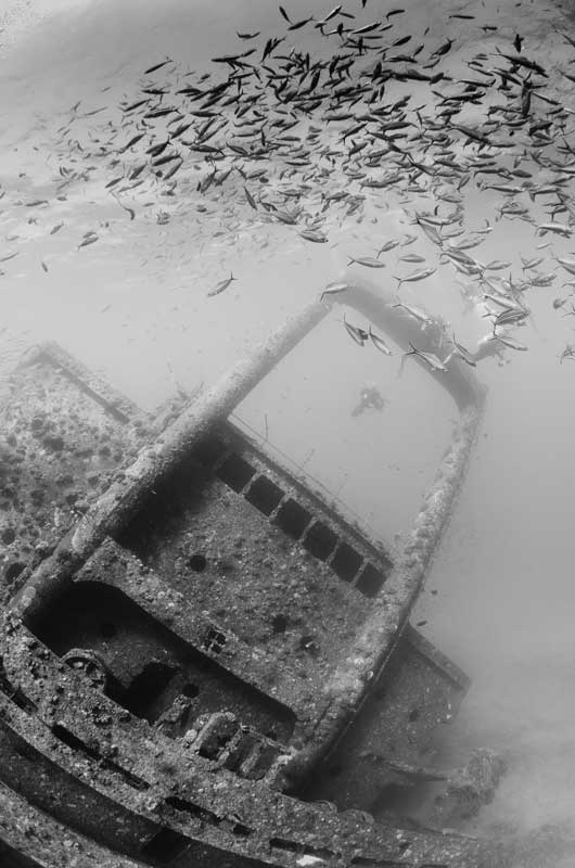 Efter et tjekdyk starter jeg i den svære ende med at prøve at tage vidvinkelbilleder med blitz på et vrag – minestrygeren El Miniya ud for Hurghada. Sigten her tæt på havnen er halvskidt efter normale forhold i Rødehavet, og der er mange partikler i vandet. Det bliver hurtigt klart, at det gælder om at have styr på blitzenes position i forhold til kameraet. De skal så langt ud som muligt, og gerne sidde lidt bagved kameraet. Mindste fejlplacering og billederne rammes af snestorme i kanten, fordi blitzlyset reflekteres af partiklerne i vandet. Man kan naturligvis rense lidt op i efterbearbejdningen, men det er meget bedre at få gode billeder fra starten.