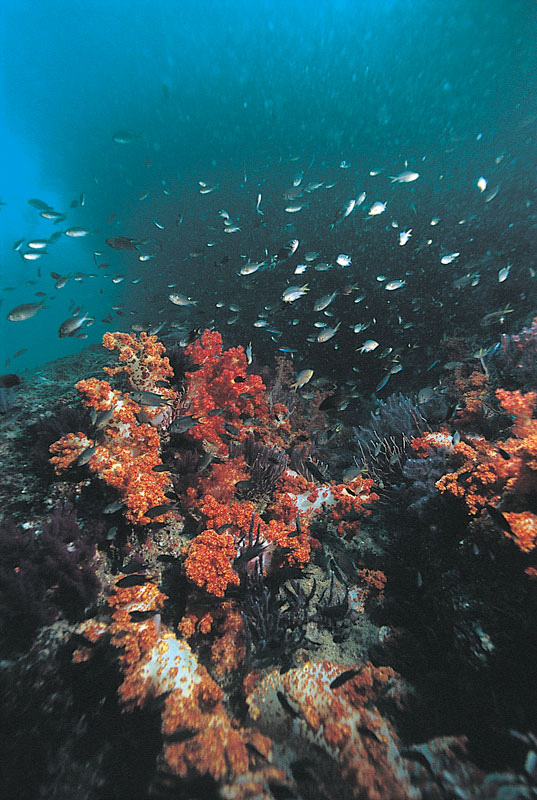 Ved stævnen bliver jeg straks omgivet af blå arabiske kejserfiske med den gule plet på siden. På trods af navnet forekommer de ikke kun i arabiske vande. Jeg har set dem, både alene og parvis i Rødehavet og ud for Afrikas østkyst. Men her optræder de i store familier, og de største eksemplarer er mindst tre gange så store og fede som andre, jeg har set.