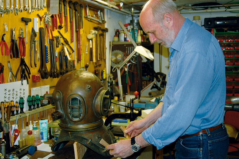 Jeg var med til at starte Dykkehistorisk Selskab. Jeg står for materiellet, og prøver at gøre det gamle grej, vi får ind, dykbart. Jeg kan godt lide mekanikken i dykkerudstyr, og har altid selv repareret og lavet stumper. Jeg har tre komplette tungudrustninger med pumper, slanger hjelme, dragter og bly, som er restaureret op: en dansk to bolts-hjelm, en tysk Dräger og en russer. Til dem har jeg restaureret nogle gamle pumper, som nu fungerer. Jeg måtte selv lave manchetterne til stemplerne i sålelæder, og nu fungerer de perfekt.
