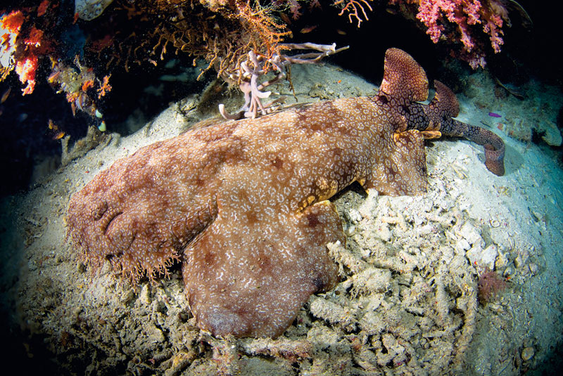 Jeg så både store frynsede wobbegong-hajer og mindre eksemplarer. De kaldes også carpet sharks, og det virkede, som om de var overalt. De kan blive op imod to meter lange, så det er ret store fisk, der kan blive offer for deres baghold. Ved én lejlighed lå jeg en lang stund og betragtede en stime af storøjede snappere. Stimen strøg troskyldigt rundt og var helt uvidende om, at de var i farezonen tæt på en wobbegong midt ude på bunden.