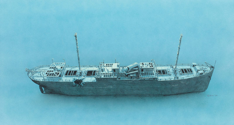 Det er en fornøjelse at svømme rundt på dækket på det enorme vrag. Sigten er sjældent særlig god her, men dyrelivet er imponerende. Store dragefisk svæver omkring, og talrige pragtanemoner med tilhørende klovnfisk har slået sig ned på vraget. Mest imponerende er søanemonen ved det store ”M” på skorstenen.